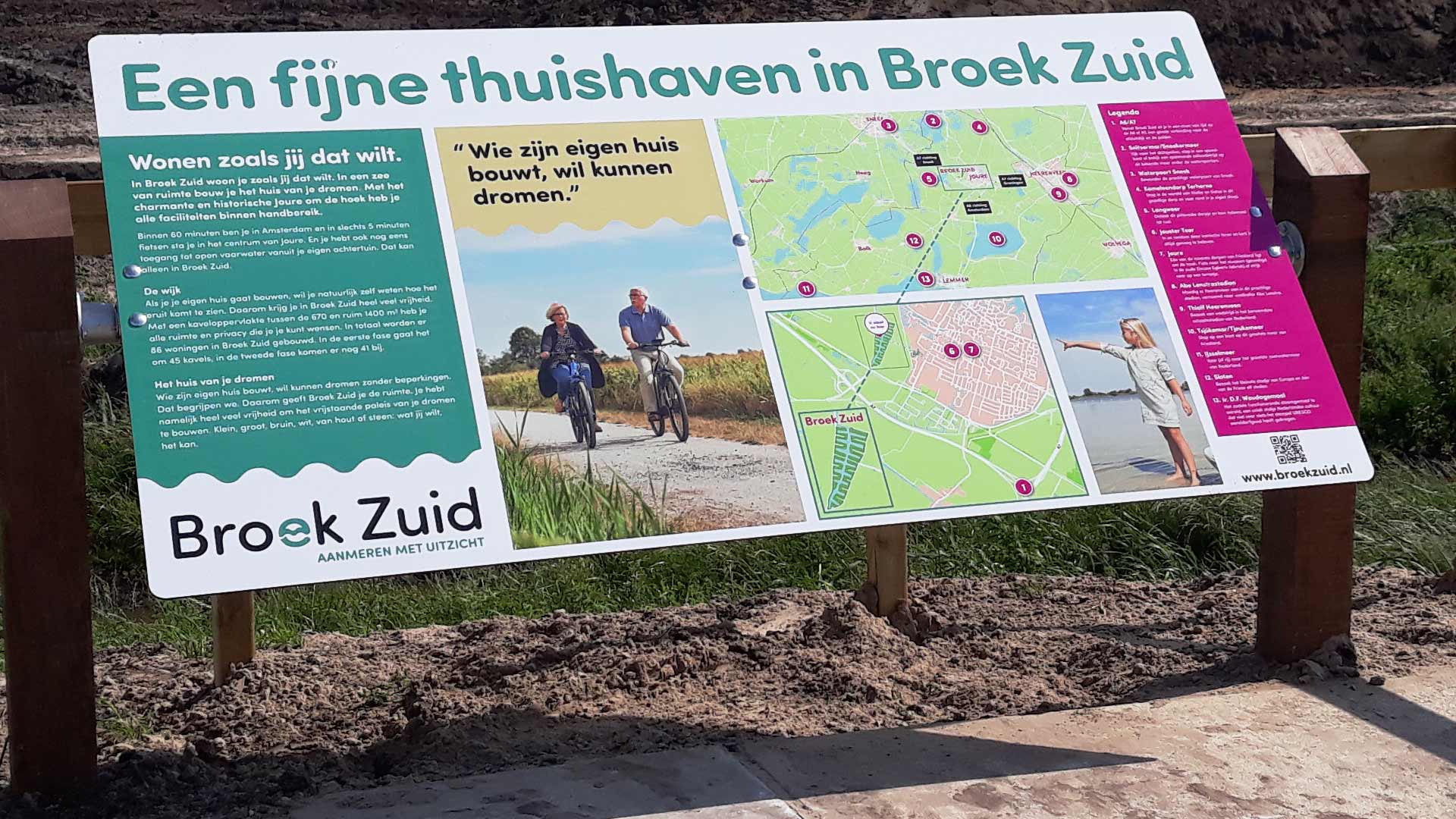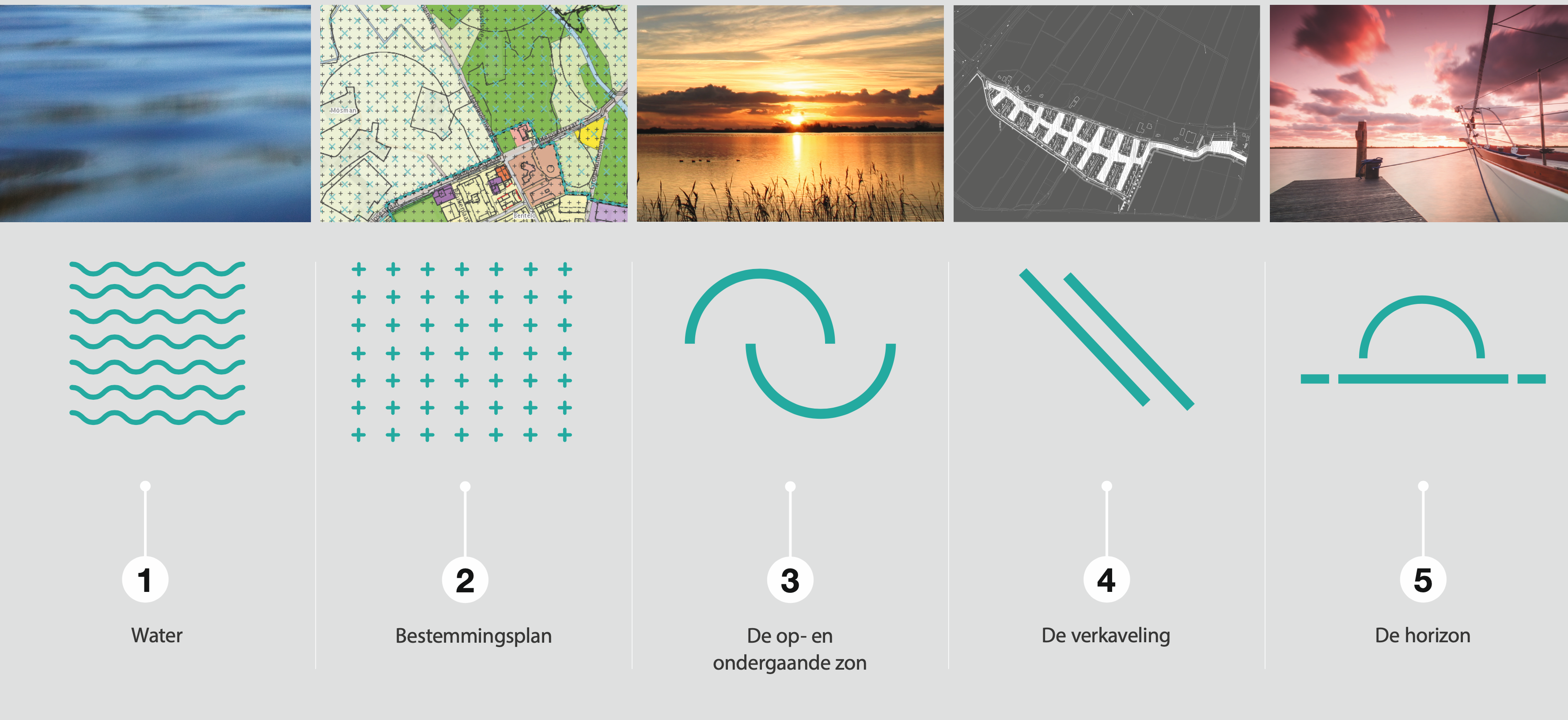In Broek Zuid you buy a plot where your boat is in the backyard; ready to explore the beautiful Frisian lakes. We reflected this in the theme logo, where the ‘e’ visualizes a setting sun in the water. This movement in the letter ‘e’ is also reflected in the further translation to various graphic elements.